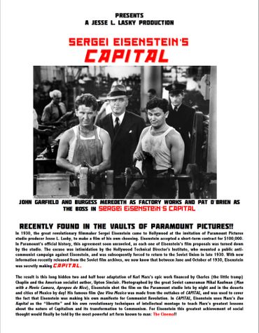 In Paramount’s official history, this agreement soon unraveled, as each one of Eisenstein’s film proposals was turned down by the studio. The excuse was intimidation by the Hollywood Technical Director's Institute, who mounted a public anticommunist campaign against Eisenstein, and was subsequently forced to return to the Soviet Union in late 1930. With new information recently released from the Soviet film archives, we now know that between June and October of 1930, Eisenstein was secretly making CAPITAL.